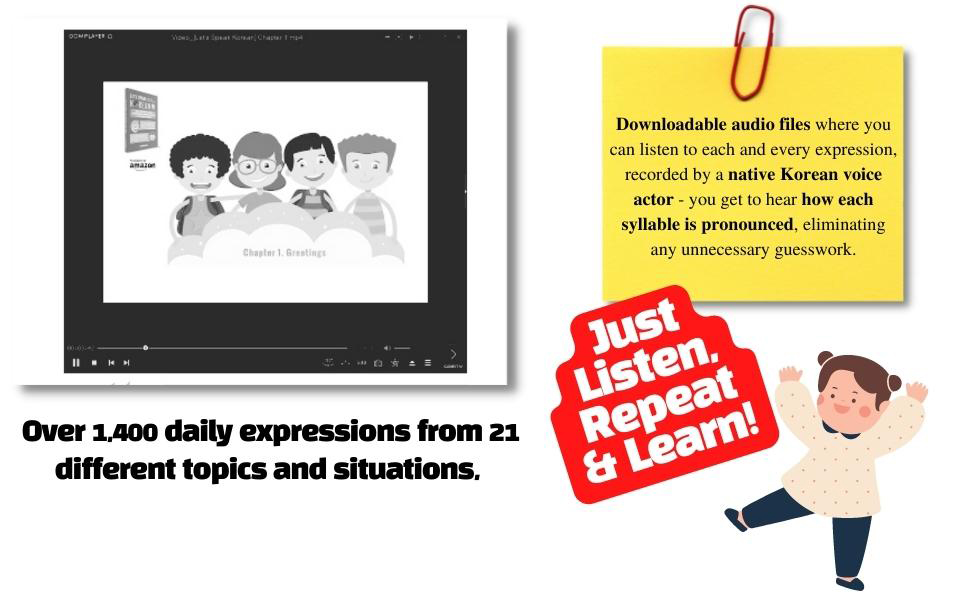 Within its pages, you’ll find over 1,400 daily expressions covering 21 diverse topics and situations. Designed for learners with no prior knowledge of Korean, you can start using these expressions immediately by simply listening and repeating.