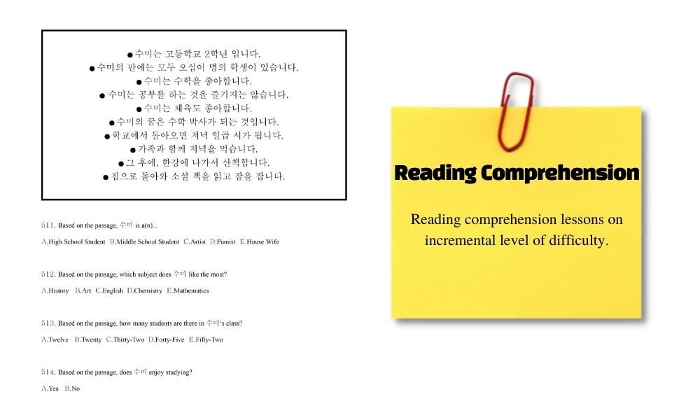 Looking to enhance your Korean reading comprehension skills to prepare for tests like TOPIK? Our comprehensive self-study workbook is specially designed to help you excel in Korean reading comprehension. With over 500 thoughtfully crafted questions spanning 5 different difficulty levels, you’ll systematically build the necessary skills to conquer any reading challenge!