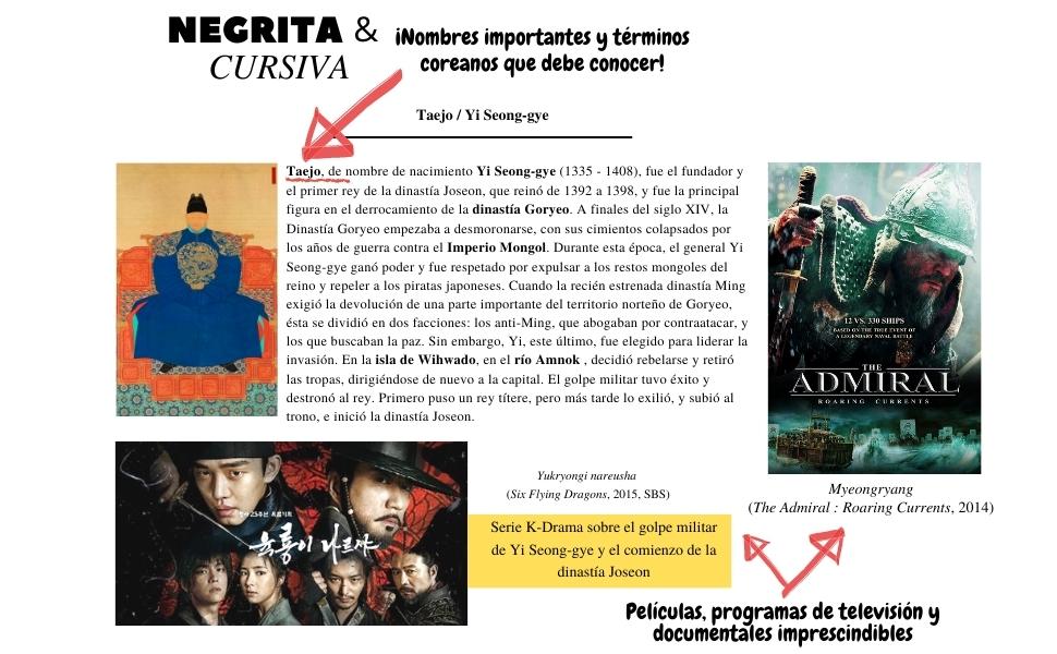 – Términos y personas imprescindibles: Hemos marcado los términos coreanos importantes con negrita y cursiva para que puedas utilizarlos como ayuda al estudio.