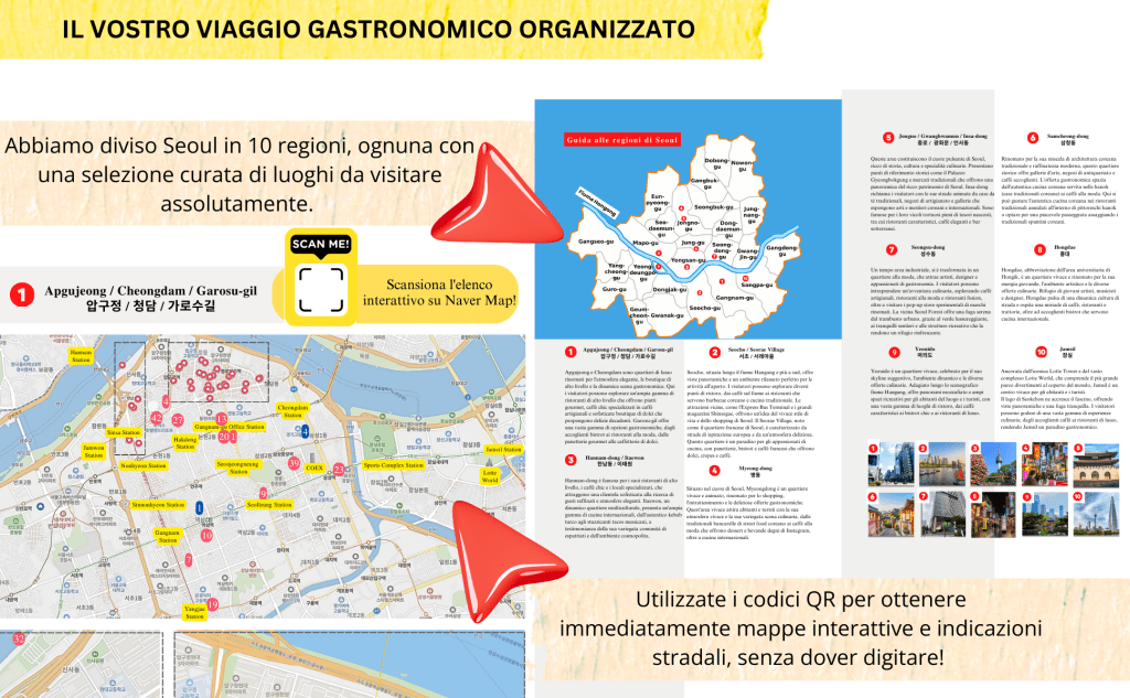 Abbiamo diviso Seoul in 10 regioni, ognuna con una selezione curata di luoghi da visitare assolutamente. Utilizzate i codici QR per ottenere immediatamente mappe interattive e indicazioni stradali, senza dover digitare!