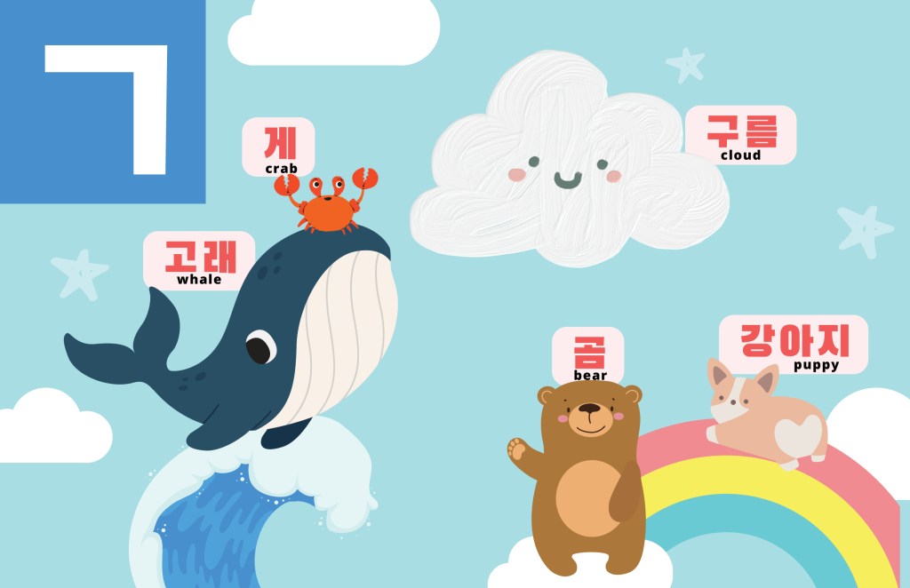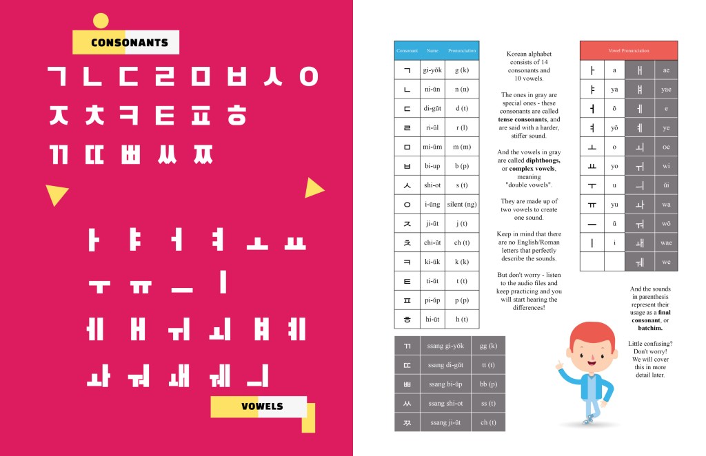 This book covers all 19 consonants of Hangul, the Korean alphabet, and 21 vowels! Each consonant and vowel has a dedicated page with corresponding words.