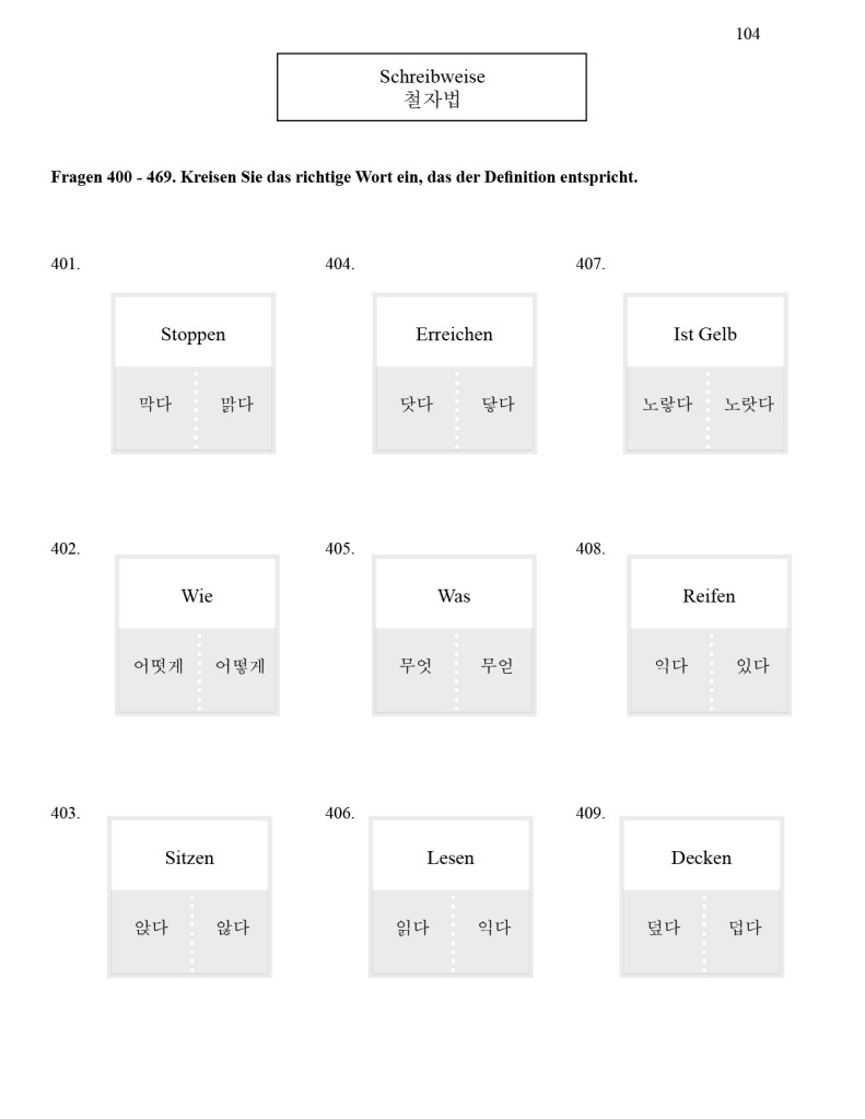 Koreanisch Lernen – Komplettes Arbeitsbuch für Grammatik, Rechtschreibung, Wortschatz und Leseverständnis ist eine hervorragende Ergänzung für das Koreanisch-Lernen, da es sorgfältig ausgearbeitete Fragen zur koreanischen Grammatik, Hangul-Rechtschreibung, Wortschatzübungen und zum Leseverständnis enthält. Diese Fragen sind nach aufsteigenden Schwierigkeitsgraden strukturiert, um den Lernprozess zu erleichtern.