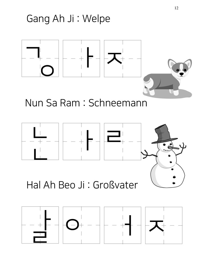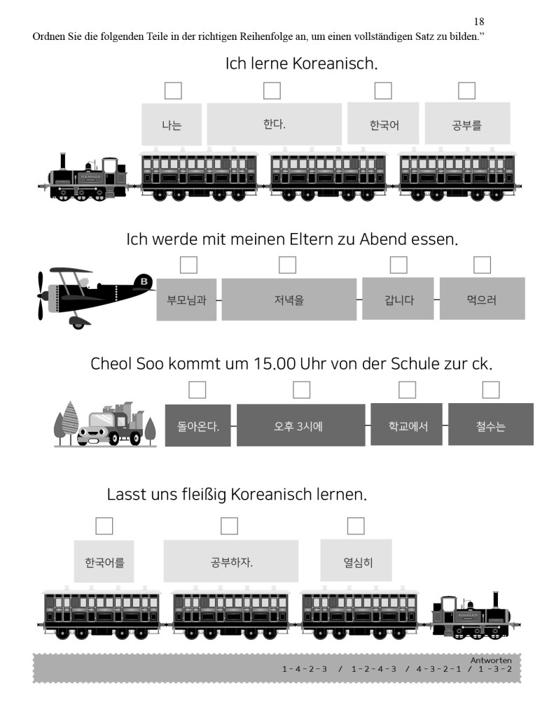 Unser Arbeitsbuch bietet über 600 Fragen zu folgenden Themen: Koreanisches Alphabet Subjekt / Objekt / Partikel Prädikate Satzarten Nachahmung von Wörtern Adjektive Ehrenwörter Vergangenheit / Gegenwart / Zukunft Wortschatz / Rechtschreibung Leseverständnis
