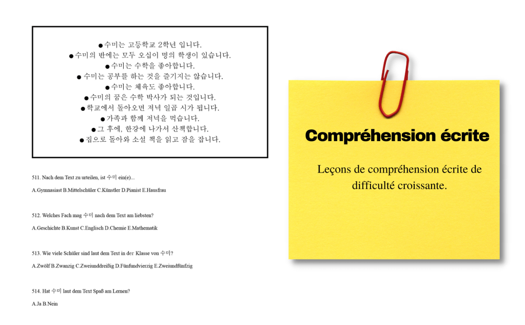Apprendre le coréen – Cahier d’exercices complet pour la grammaire, l’orthographe, le vocabulaire et la compréhension écrite avec plus de 600 questions, cet ouvrage est un excellent complément pour l’apprentissage du coréen, car il contient des questions soigneusement élaborées sur la grammaire coréenne, l’orthographe du hangul, des exercices de vocabulaire et de compréhension écrite.