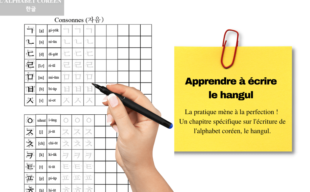 Apprendre à écrire le hangul – la pratique mène à la perfection ! Un chapitre spécifique sur l’écriture de l’alphabet coréen, le hangul.