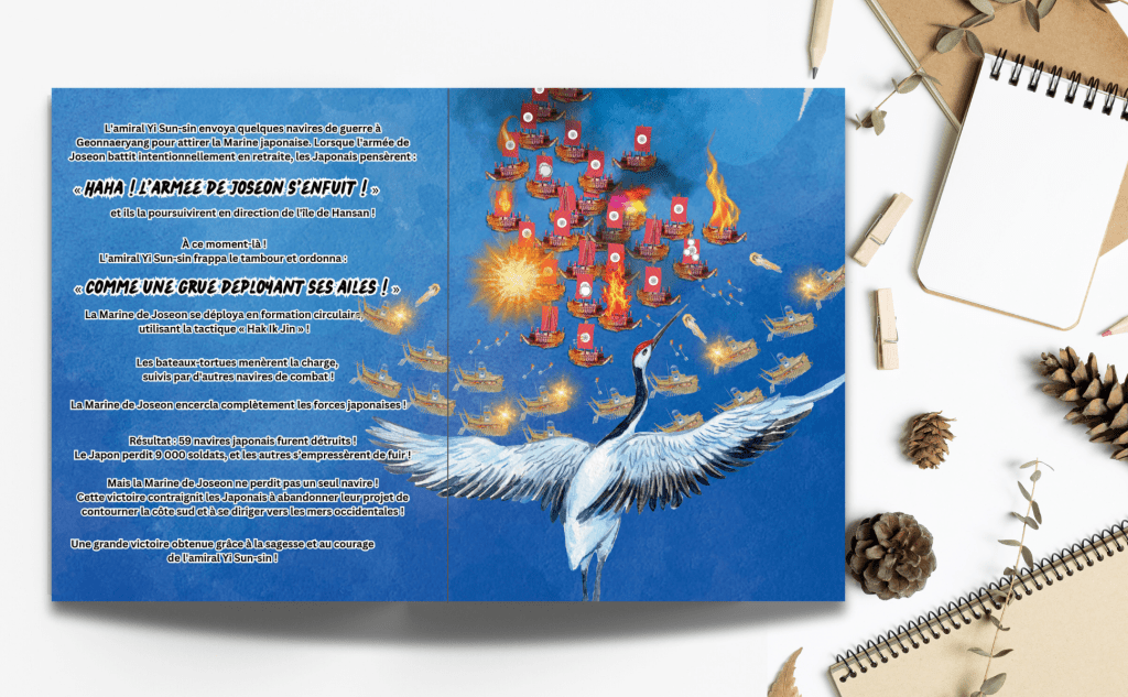 ● Pour les lecteurs non coréens : Découvrez une partie passionnante, mais moins connue de l’histoire mondiale. Les tactiques brillantes de l’amiral Yi Sun-sin et ses leçons de leadership sont une source d’inspiration, même au-delà des frontières coréennes. Que vous aimiez l’histoire, la stratégie militaire ou les récits héroïques, son histoire devrait être connue de tous.