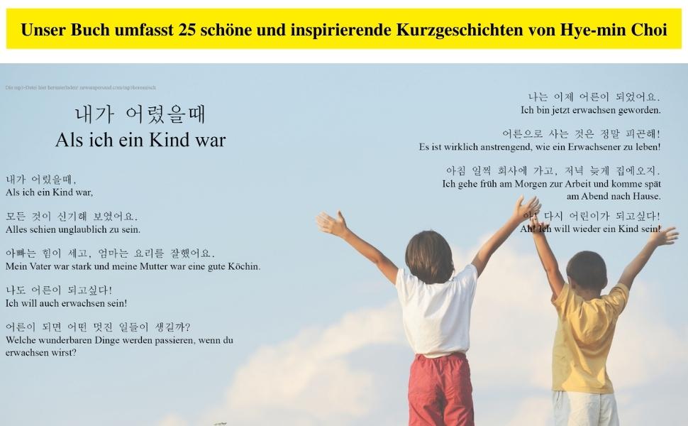 Unser Buch umfasst 25 schöne und inspirierende Kurzgeschichten von Hye-min Choi, die auf Koreanisch und Deutsch vor dem Hintergrund farbenfroher Illustrationsserien präsentiert werden.