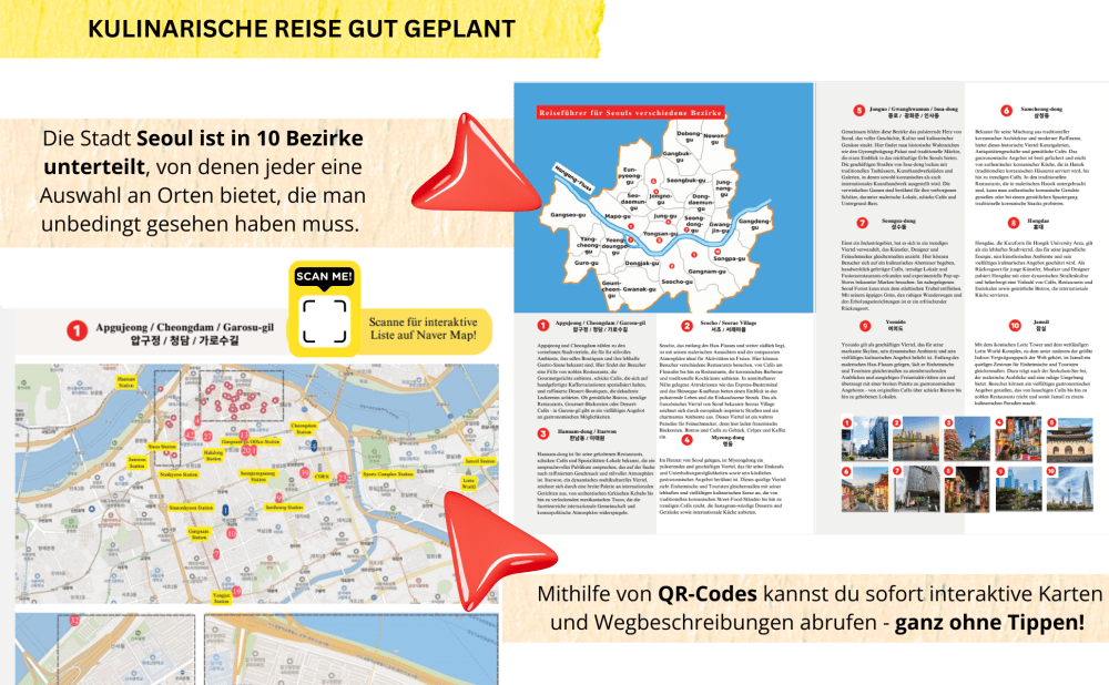 Die Stadt Seoul ist in 10 Bezirke unterteilt, von denen jeder eine Auswahl an Orten bietet, die man unbedingt gesehen haben muss. Mithilfe von QR-Codes kannst du sofort interaktive Karten und Wegbeschreibungen abrufen – ganz ohne Tippen!