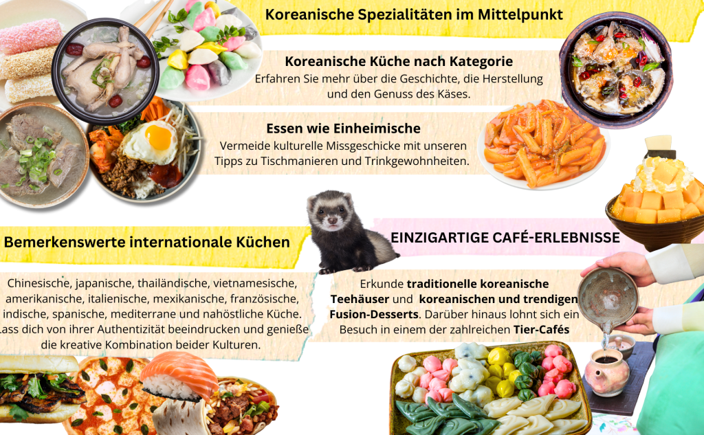– Bemerkenswerte internationale Küchen: Abgesehen von der koreanischen Küche bietet Korea erstaunliche internationale Gerichte, darunter chinesische, japanische, thailändische, vietnamesische, amerikanische, italienische, mexikanische, französische, indische, spanische, mediterrane und nahöstliche Küche. Lass dich von ihrer Authentizität beeindrucken und genieße die kreative Kombination beider Kulturen.