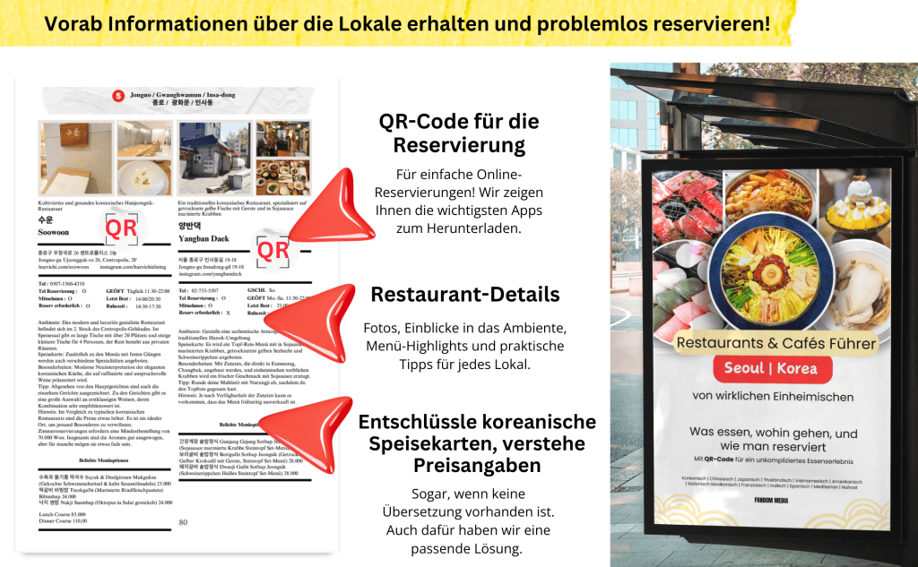 – Navigieren Sie sicher durch die Speisekarten: Entschlüssle koreanische Speisekarten, verstehe Preisangaben und fühle dich nicht ratlos – sogar, wenn keine Übersetzung vorhanden ist. Auch dafür haben wir eine passende Lösung.