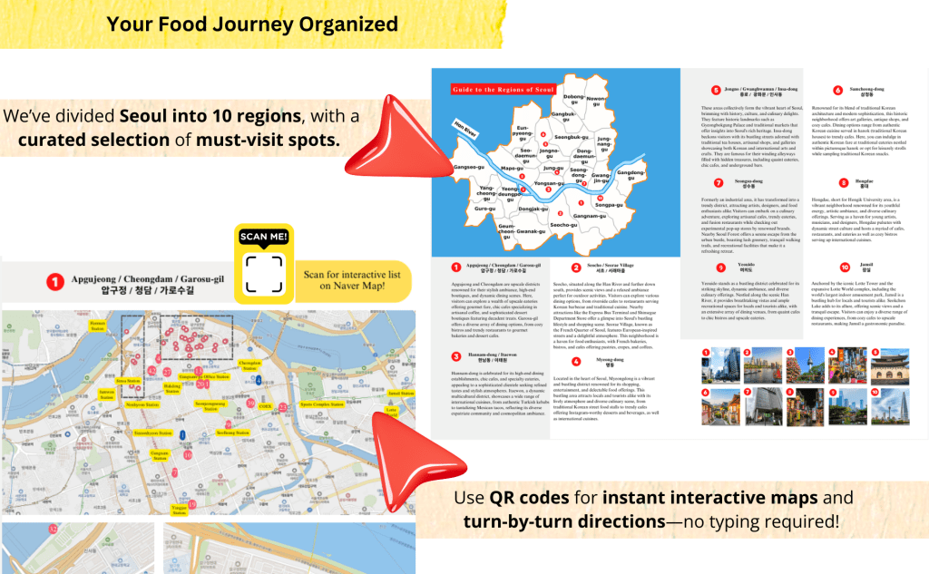 We’ve divided Seoul into 10 regions, each featuring a curated selection of must-visit spots. Use QR codes for instant interactive maps and turn-by-turn directions—no typing required!