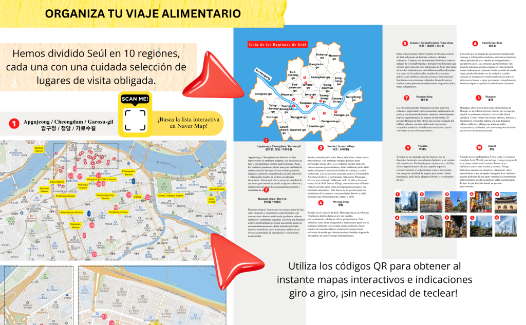 Hemos dividido Seúl en 10 regiones, cada una con una cuidada selección de lugares de visita obligada. Utiliza los códigos QR para obtener al instante mapas interactivos e indicaciones giro a giro, ¡sin necesidad de teclear!