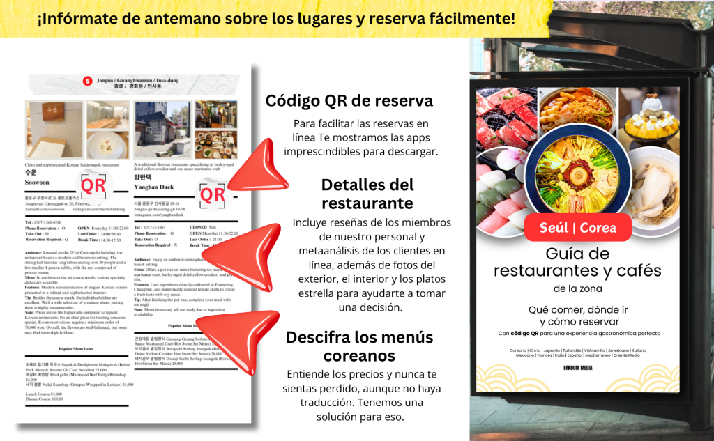 – Cena como un lugareño: Evita los errores culturales con nuestros consejos sobre etiqueta al comer y costumbres al beber. (Sí, al comer un rollito de lechuga a la barbacoa coreana, no debes partirlo por la mitad como harías con un taco).