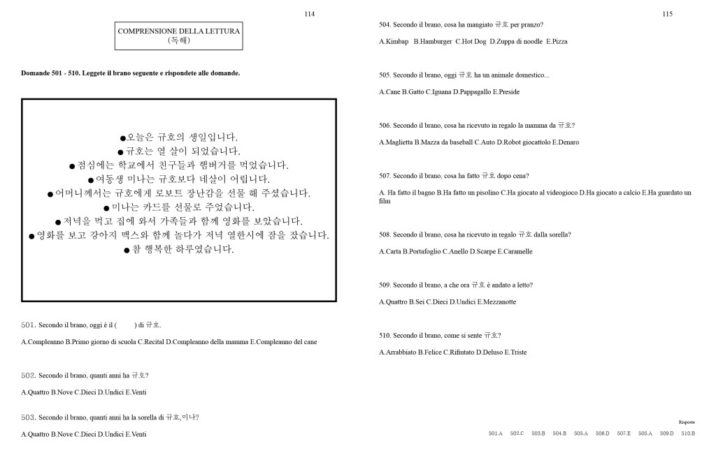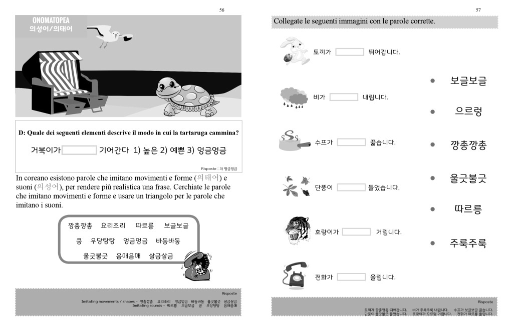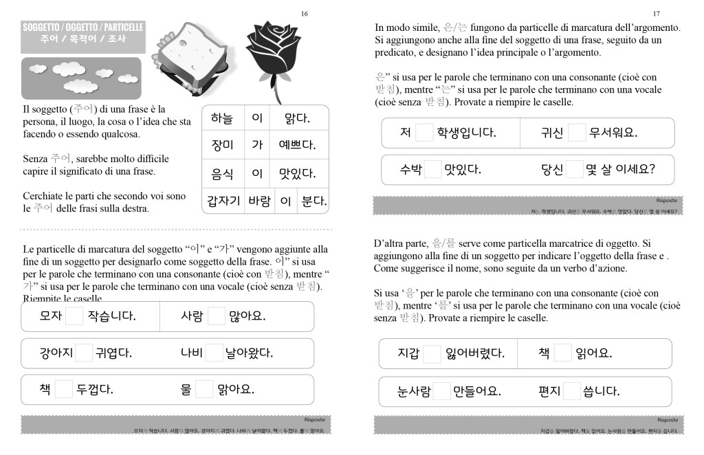 Il nostro libro di lavoro contiene oltre 600 domande su: Alfabeto coreano Soggetto / Oggetto / Particelle Predicati Tipi di frasi Imitazione di parole Aggettivi Onorifici Passato / Presente / Futuro Vocabolario / Ortografia Lettura Comprensione